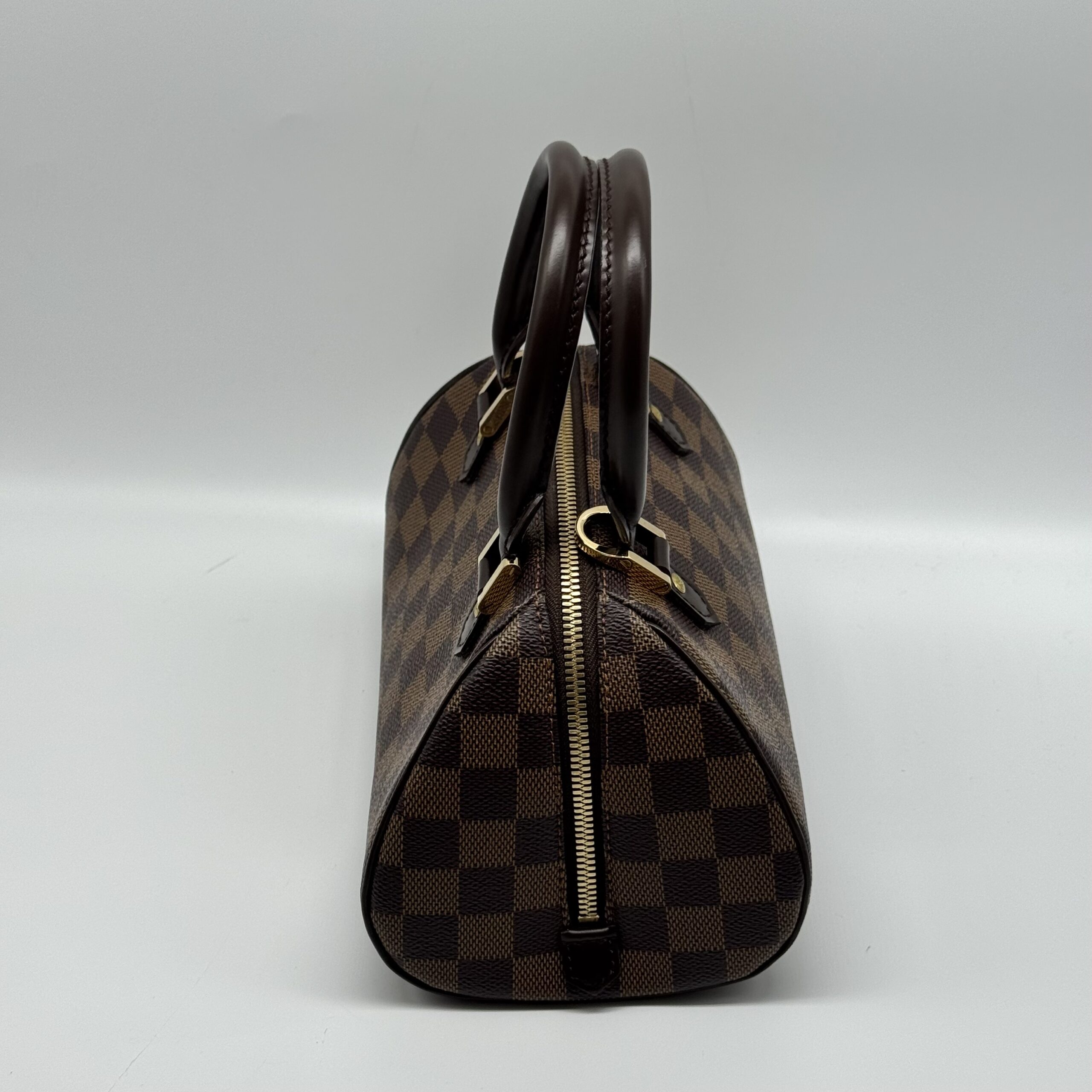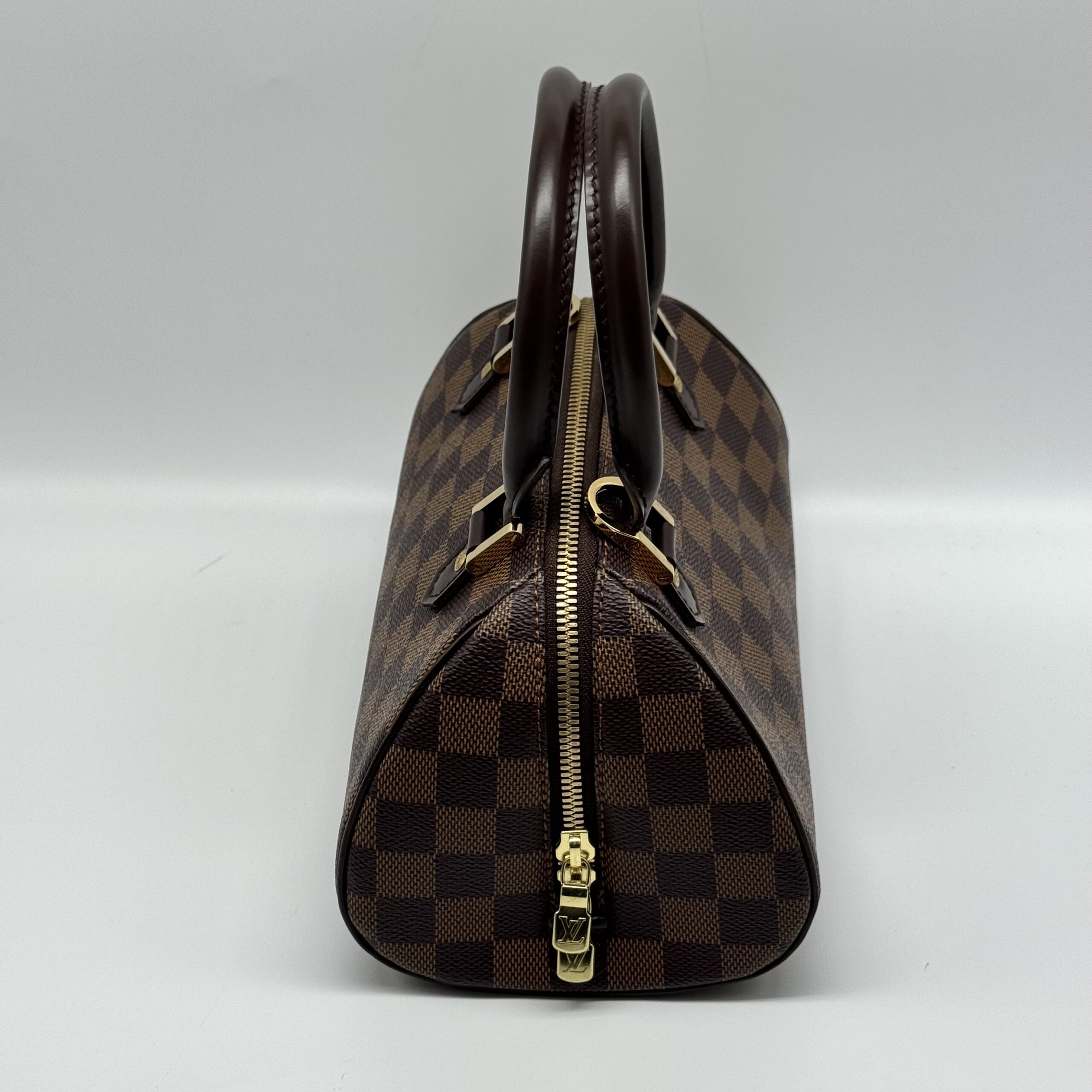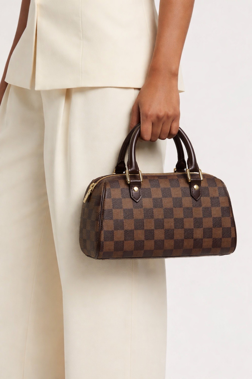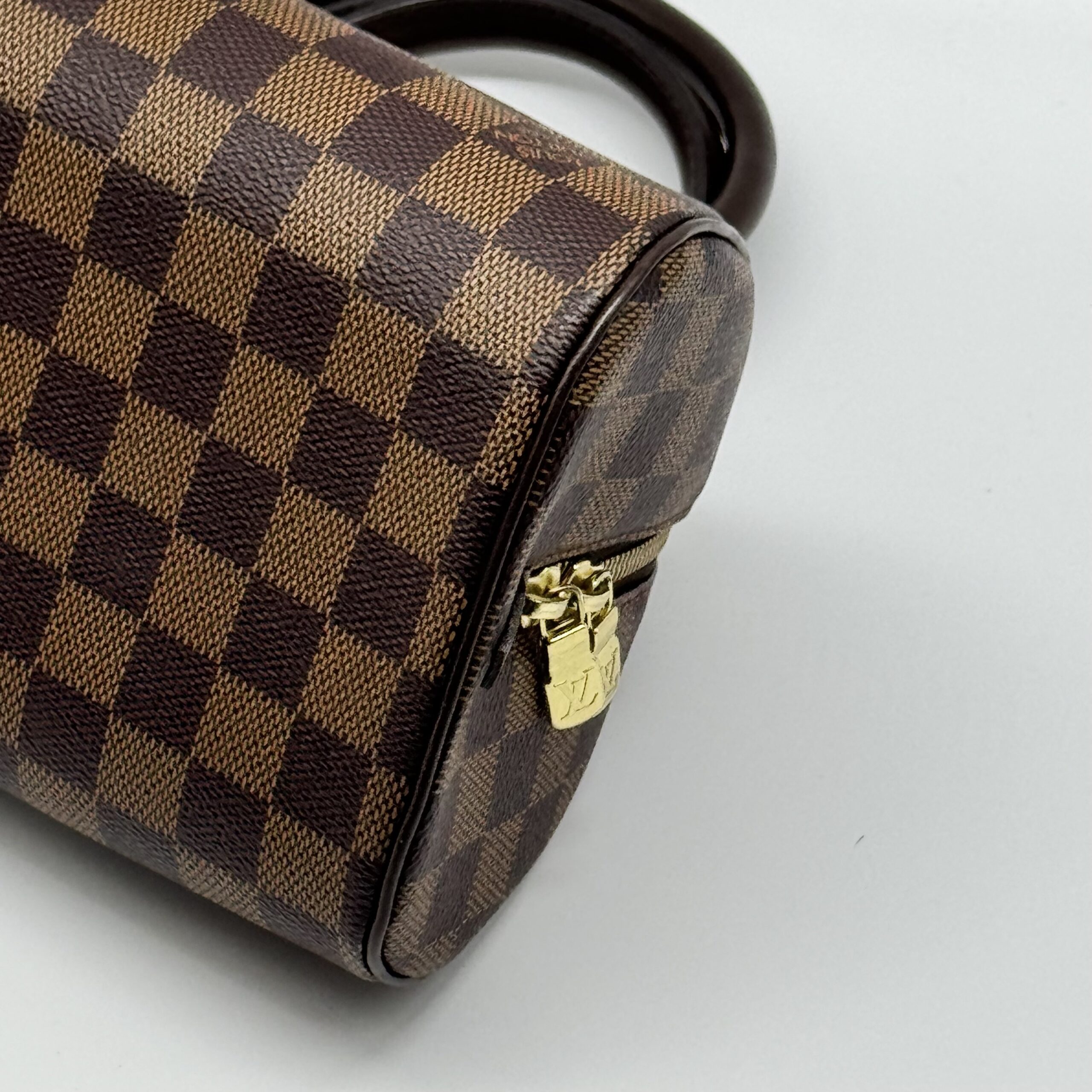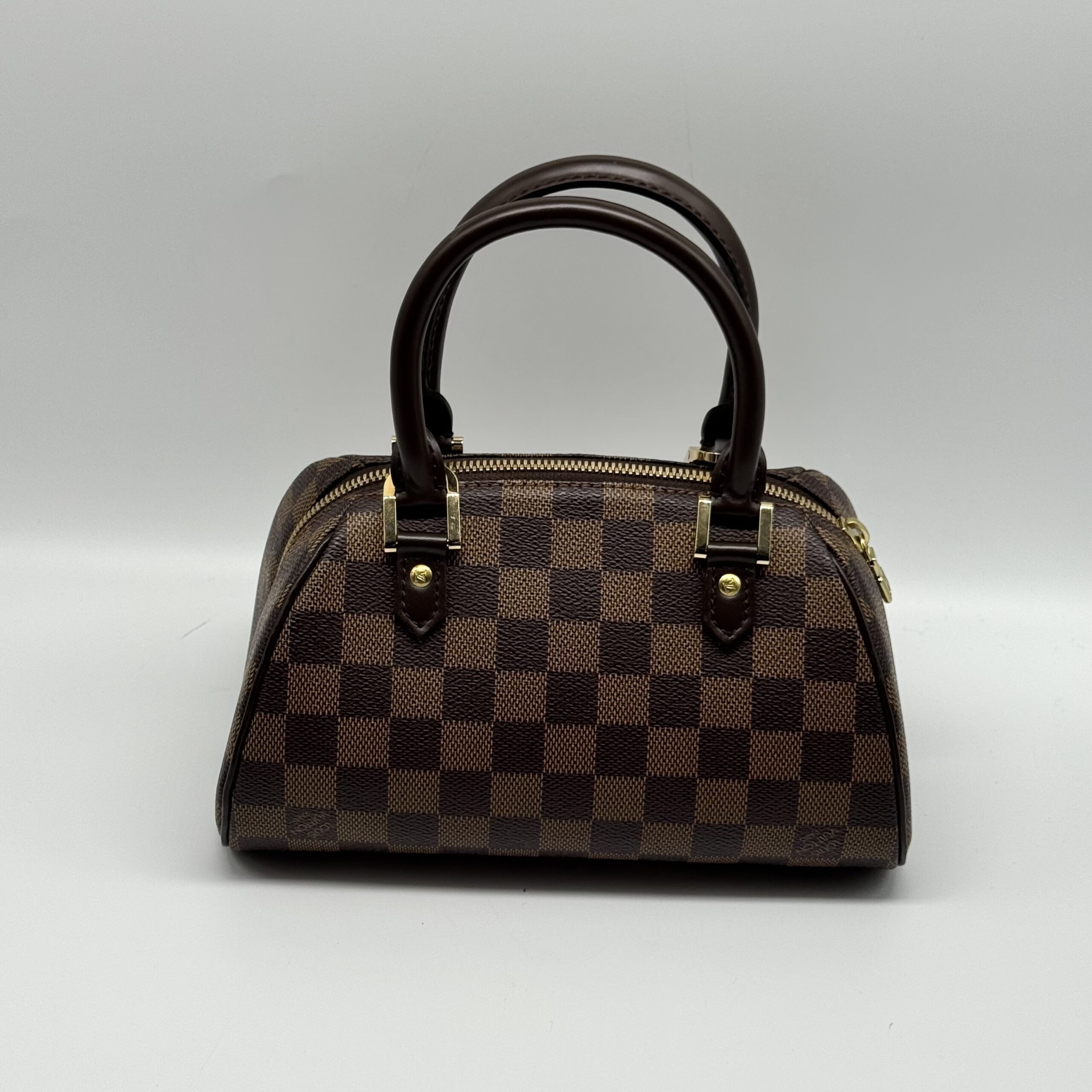 The image displays the LOUIS VUITTON Mini Riberia Bag. It highlights the bag’s compact size and the Damier Ebene pattern. The top handle is clearly visible, emphasizing its convenience. The bag appears to be a stylish choice for everyday use.